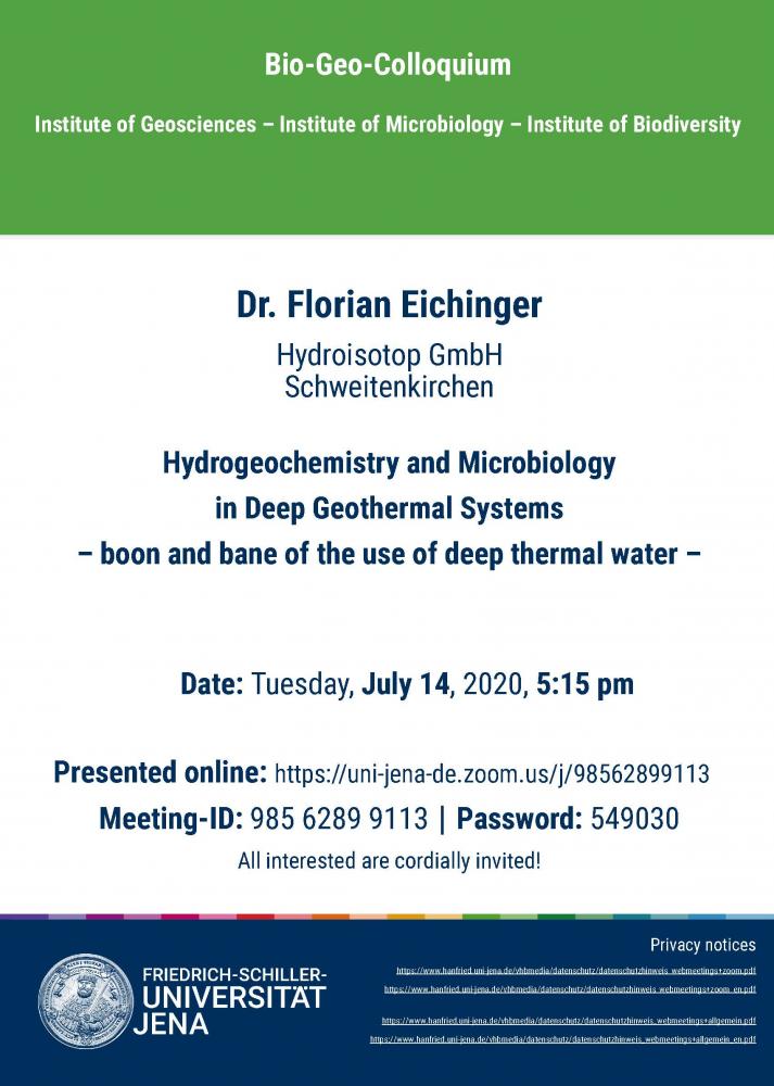 Dr. Florian Eichinger spricht am 14.07.2020, 17:15 Uhr, im Rahmen des BioGeo-Colloquiums der Universität Jena über "Hydrogeochemistry and Microbiology in Deep Geothermal Systems". Der Vortrag wird online gehalten und ist für die Öffentlichkeit zugänglich.