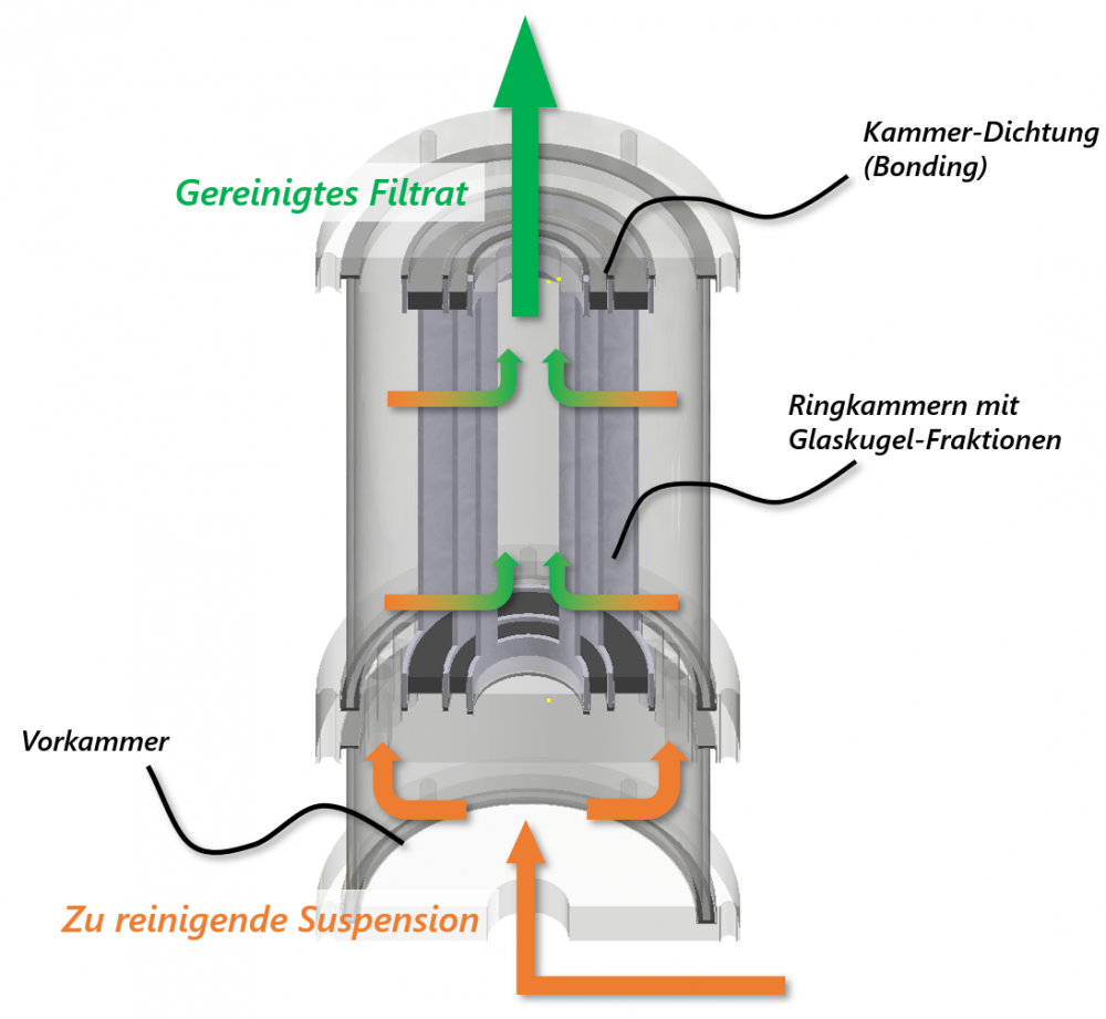 Das Verbundprojekt „SpheroFilt“ ist Teil der BMBF-Fördermaßnahme „KMU-innovativ“ im Anwendungsbereich „Nachhaltiges Wassermanagement“. Im Rahmen des Forschungsvorhabens SpheroFilt wurde eine Vorrichtung zur mechanischen Entfernung partikulärer Feststoffe aus Wässern über ein innovatives Trennverfahren entwickelt. Bei diesem neuartigen Trennverfahren werden Glaskugeln unterschiedlicher Korngröße als Filtermedien verwendet, die, eingebracht in ringförmigen Filterkammern, im Wasser suspendierte Feststoffe der Filtermaxime entsprechend von grob nach fein mit definierter Trennschärfe filtrieren. Erstmals werden Glaskugeln zur Oberflächenfiltration verwendet, deren Vorzüge einer einfachen Rückspülbarkeit auch in der Oberflächenfiltration zum Tragen kommen.